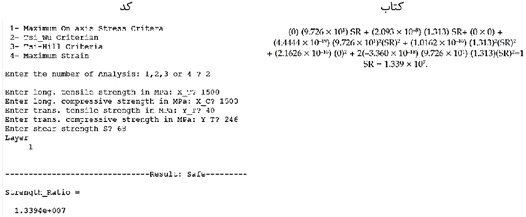 این برنامه جهت محاسبه تنش و کرنش و همچنین تحلیل تخریب در کامپوزیت پلیمری لایه های در نرم افزار MATLAB 7.12 نوشته شده است. جهت کد نویسی از تئوری کلاسیک صفحات کامپوزیتی استفاده شده است. ابتدا خواص ماده، ترتیب لایه چینی، تعداد لایهها، زاویه لایهها و ضخامت هر لایه کامپوزیت بهعنوان ورودی وارد میشود. سپس ماتریسهای B،A و D کامپوزیت محاسبه میگردند. بارگذاری روی لایه چینی میتواند دارای 3 مولفه نیرو و 3 مولفه تنش باشد که بهعنوان ورودی وارد میشود. با توجه به بارگذاری وارد شده، در ابتدا کرنشهای لایه ای (Laminate) در جهات بارگذاری محاسبه میشوند. کرنش در هر لایه کامپوزیت با استفاده از کرنش کلی و انحنا به دست میآید. با یک دوران، کرنش در هر لایه از جهات فرعی به جهات اصلی (مادی) انتقال داده میشود. با استفاده از روابط تنش و کرنش، تنشها در هر لایه محاسبه میشوند.