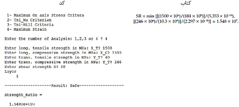 پس از محاسبه تنشها و کرنشها در هر لایه کامپوزیت، میتوان از تئوریهای تخریب برای لایه چینی استفاده نمود. در این کد از تئوریهای تنش ماکزیمم، کرنش ماکزیمم، سای هیل (Tsai-Hill) و سای وو (Tsai-Wu) استفاده شده است. برای هر کدام از این تئوریها یک ضریب ایمنی توسط کد ارائه میشود. بهطوریکه اگر تمام بارهای وارده در این مقدار ضرب شوند، تخریب آغاز میشود. بنابراین میتوان محاسبه نمود که چه میزان نیرو یا ممان وارده باعث آغاز تخریب خواهند شد. طبیعی است که اگر ضریب ایمنی از 1 کمتر باشد، تخریب رخداده است.