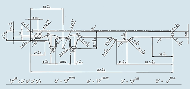 در نقشه قطعه، سطوحی لوح زنی دقیق با علامت —- مشخص میشوند و بقیه سطوح که لوح زنی معمولی هستند با خط معمولی کشیده میشوند. به عنوان مثال شکل (2-13) یک قطعهای را نشان میدهد که بعضی قسمتهای آن لوح زنی دقیق است که مشخصات مختلف آن ارائه شده است.