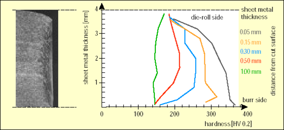 شکل (2-14) مسیر و عمق کار سختی یک قطعه لوح زنی دقیق به ضخامت 4 میلیمتر از جنس فولاد C45 را نشان میدهد. افزایش سختی در لبه لوح زنی به اندازه دو برابر مقدار اولیه، باعث افزایش قابل توجه مقاومت به سایش قطعات میشود.