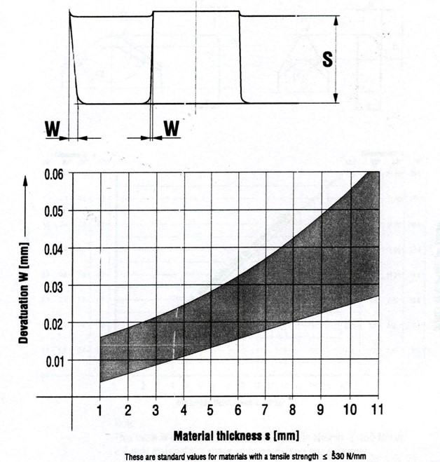 لبههای داخلی قطعه از دقت زاویهای بیشتری نسبت به سطوح و لبههای خارجی برخوردار هستند. ضخامت ورق نیز از عوامل تعیین کنندهای است که با افزایش ضخامت، دقت زاویهای کاهش مییابد. رینگ V شکل به همراه عوامل دیگر از خطاهای زاویهای میکاهد به طوری که با افزایش ضخامت، دقت زاویهای ثابت میماند.